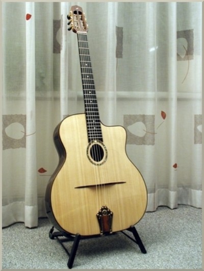To play Gipsy Jazz you really need a good Gipsy guitar. A good gipsy guitar is a handmade instrument. For the Oval Gipsy I use solid woods. I prefer Rosewood or sometimes Maple for the back and sides.