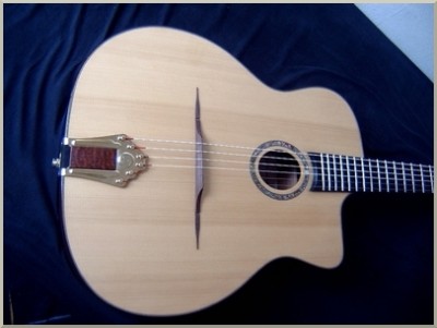 The top is European spruce or red cedar. Selmer used the spruce for the tops. But I’ve made very good instruments with cedar tops too. The neck is made of Mahogany, Maple or Walnut. All necks are reinforced by a truss rod or by carbon fibre. The regular scale is 66,5 cm and the fingerboard is ebony. I can make this instruments to your personal wishes.